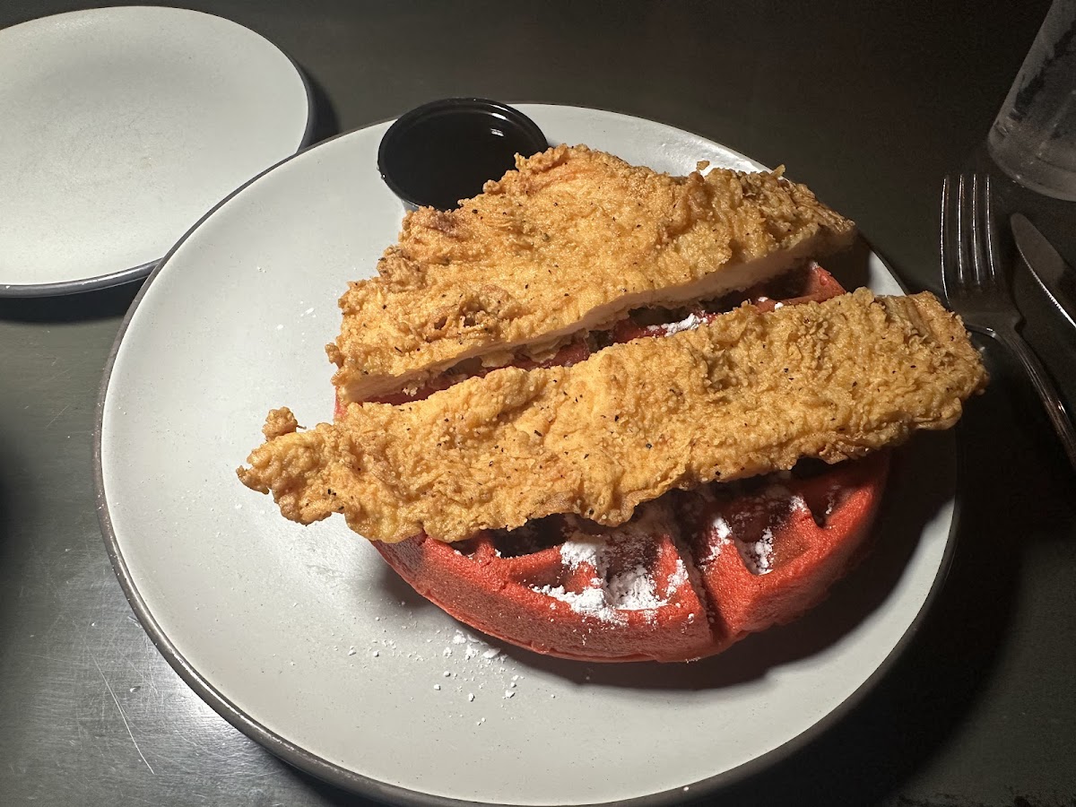 Came in for a very late dinner, and was very pleased with all that we ordered!! The crispy Brussels were by far the best dish we got, the pepper jelly and Parmesan cheese did wonders to the sprouts. The Gouda grits were heavenly, creamy, cheesy, warm and flavorful. We all thoroughly enjoyed them. Best we’ve had in a long time. The chicken and waffle were okay, the waffle was thick and fluffy but not much flavor. The chicken was thin and crispy , it was delicious dipped in the syrup. I highly recommend this establishment!! Service was great as well.