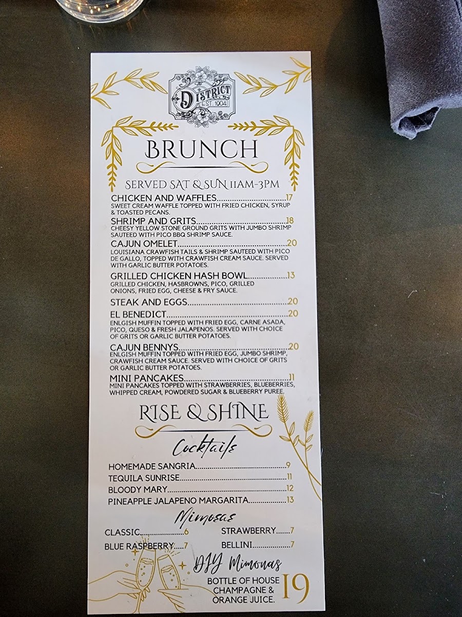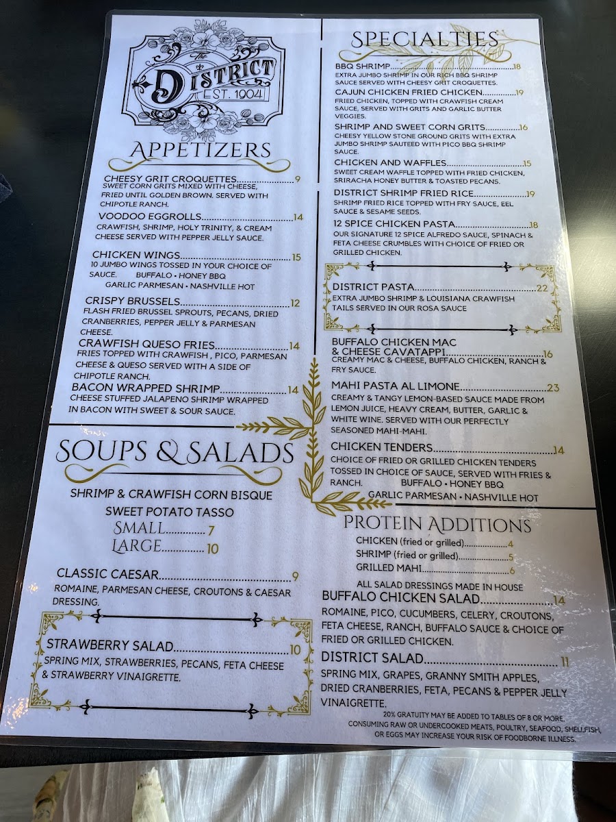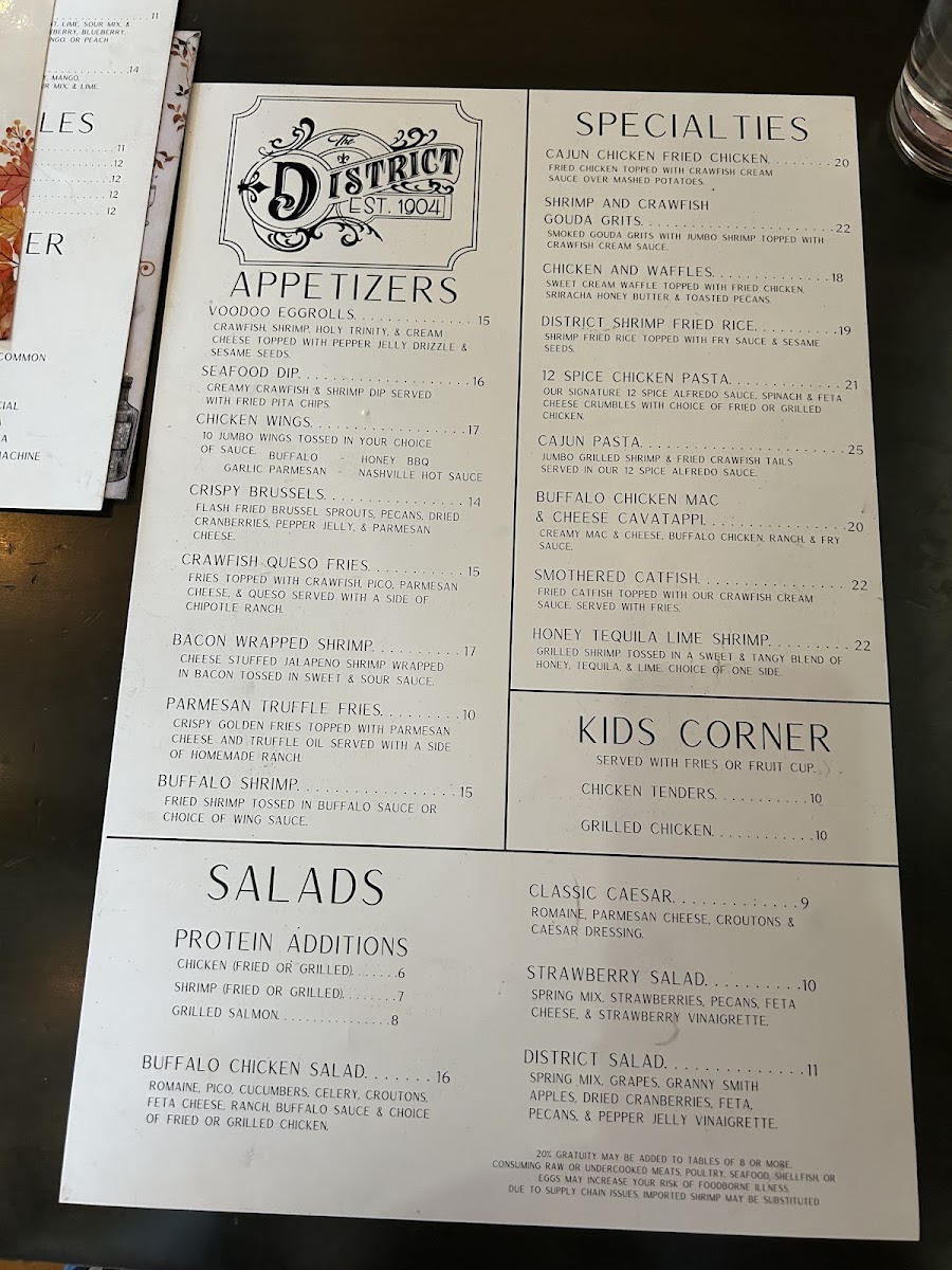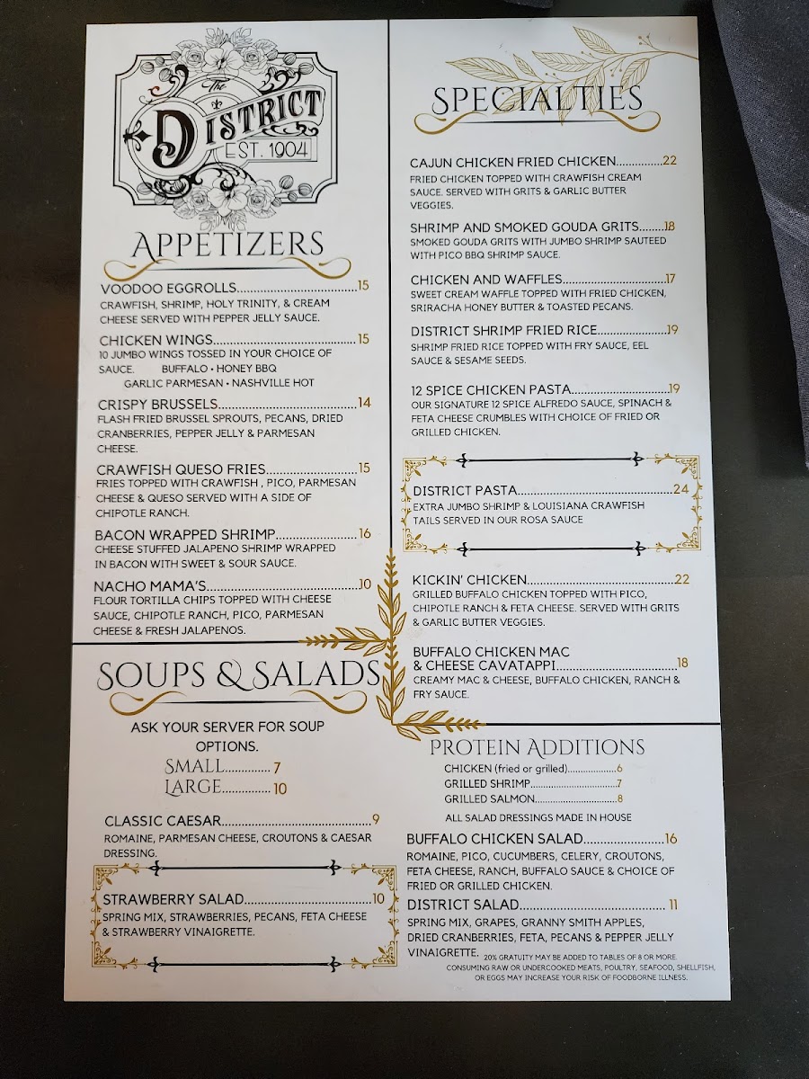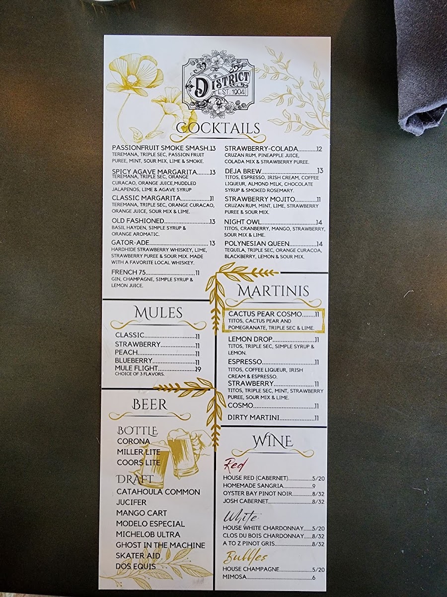 Welcome to The District, a culinary gem located in Ponchatoula, LA. This vibrant eatery boasts a menu that perfectly blends comfort with innovation. Guests rave about the Shrimp & Crawfish Gouda Grits, deemed a must-try, while the Voodoo Eggrolls provide a flavorful twist on traditional favorites. The martinis, all priced at an inviting $7, are a highlight; options like the Cactus Pear Cosmo and Salted Caramel Espresso Martini are crowd favorites that add a festive touch to any gathering.